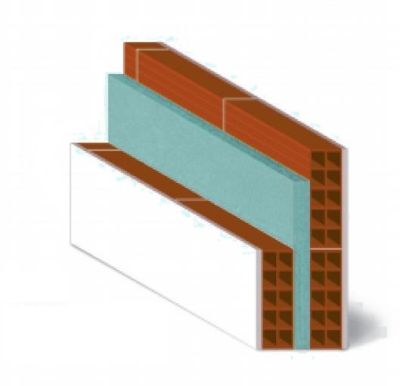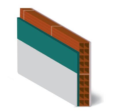 Η λύση περιλαμβάνει: 1) Εξωτερικό επίχρισμα, 2) διπλή δρομική τουβλοδομή, 3) ηχοαπορροφητικό - θερμομονωτικό υλικό.